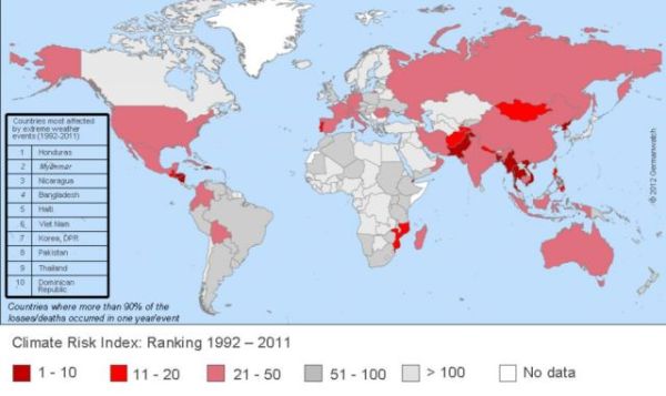 Топ лидеров индекса климатических рисков возглавили такие страны как Гондурас, Мьянма (известная также как Бирма) и Никарагуа. При номинально средних уровнях экстремальности природных явлений, в этих небогатых странах наблюдается наибольшее количество человеческих жертв.